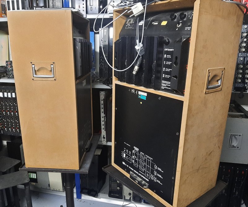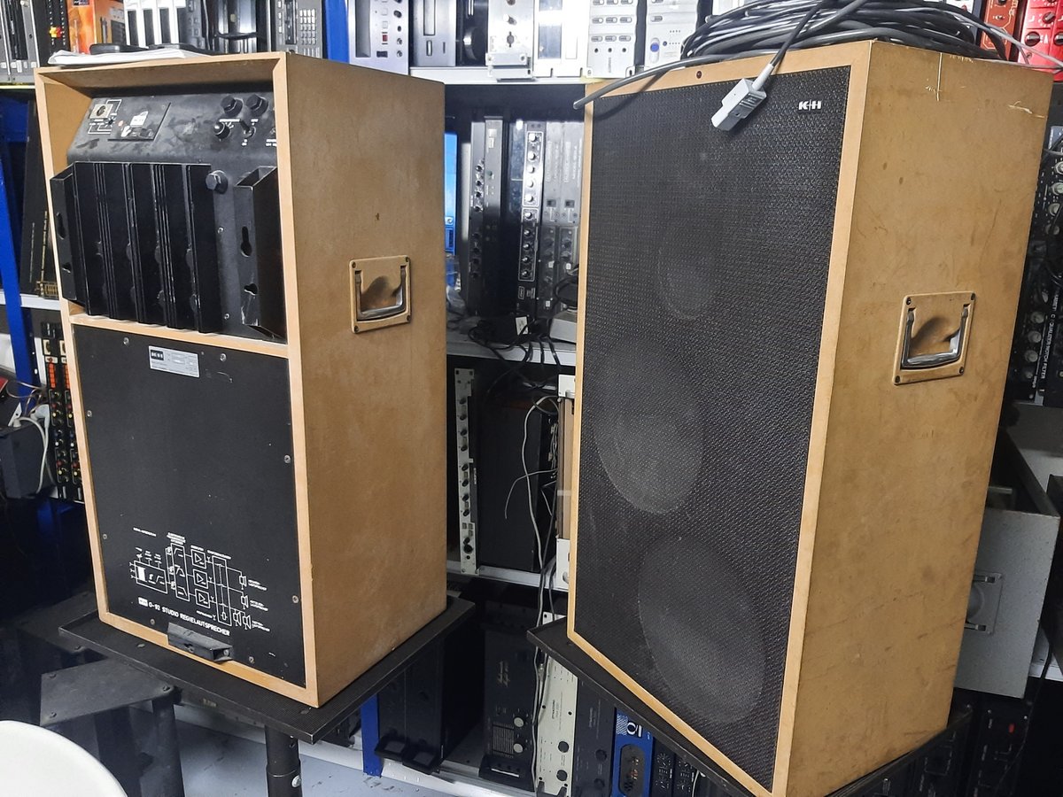 Aktiver 3 Wege Referenzmonitor der westdeutschen Rundfunkanstalten (bis mitte der 90er Jahre). Hier in einer frühen Version. Das Frontgitter ist schwarz, durch den Einsatz von Blitzlicht ist die Lautsprecherbestückung auf den Foto sehr gut zu erkennen: 2 Podszus Görlich 10" Tieftöner mit Hartschaum - Composite Membranen, ebenso wie der 5" Mitteltöner. In Natur kann man nicht durch das Frontgitter sehen...